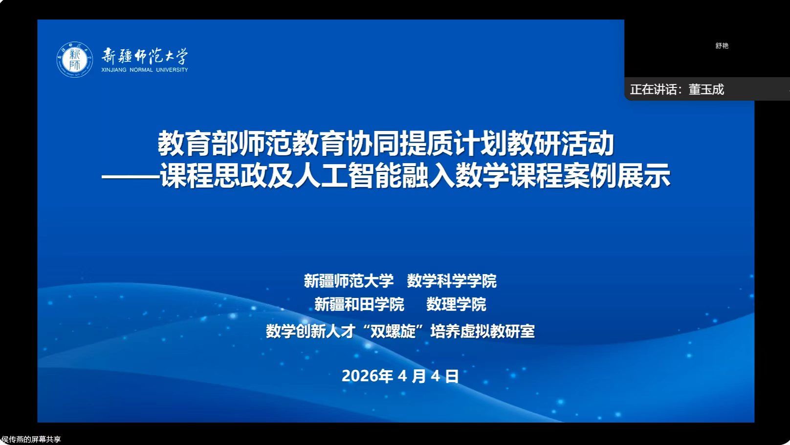 为深化数学课程思政和智慧课程建设,提升教学质量与育人实效,经过两周的精心筹备,4月4日,智慧课程+课程思政教学案例线上分享会顺利举行。本次研讨会邀请乌鲁木齐第十三中学、和田学院和本院教师分享各自实践经验,全体参会人员围绕相关议题深入交流,就后续普及与深入路径达成共识,取得了良好的研讨效果。