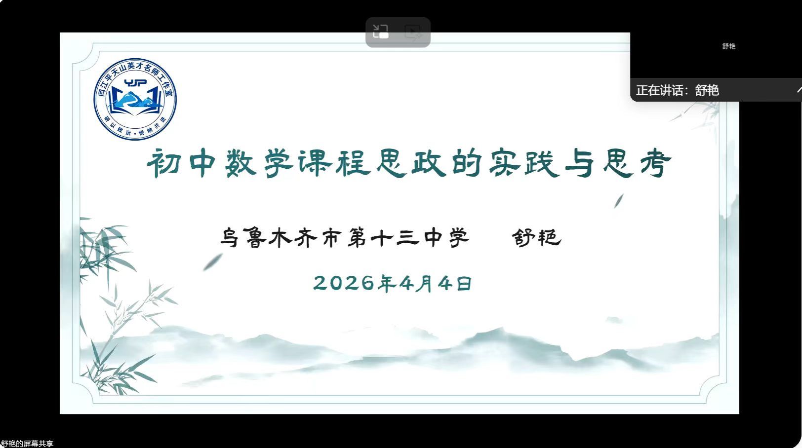 在数学课程思政教学实践环节,乌鲁木齐市十三中舒艳老师针对当前数学教学中重解题轻育人、重思维轻价值的问题,结合七年级数学教学实际,详细分享了课程思政的多样化形态,特别是在以数学为载体说好思政故事上发挥学生的主观能动性方面引人瞩目。
