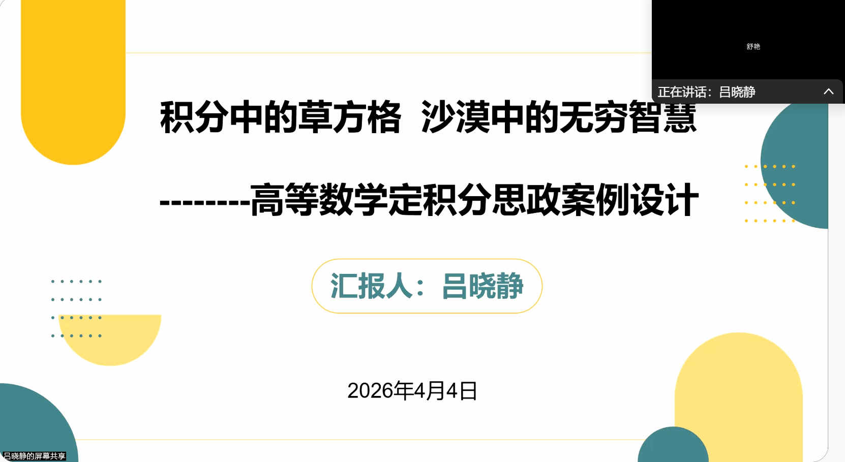 来自和田学院的吕晓静教授围绕高等数学课程思政深度融合展开分享。她以塔克拉玛干沙漠锁边工程为载体深入探讨了定积分概念的情景教学过程,在数学知识构建过程中深深体会到量变到质变、“绿水青山就是金山银山”的深刻性,体现从大处着眼、小处入手的课程思政设计路线。